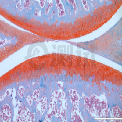 番紅-固綠(軟骨)染色法的染色原理在于嗜堿性的軟骨和堿性染料番紅O結合呈現紅色,嗜酸性的骨和酸性染料固綠結合而成綠色或者藍色,與呈現紅色的軟骨對比鮮明,從而將軟骨組織和骨組織區(qū)分開。番紅O是一種結合多陰離子的陽離子染料,其顯示軟骨組織是基于陽離子染料與多糖中陰離子基團(硫酸軟骨素或硫酸角質素)結合。番紅O著色與陰離子的濃度近似成正比關系,間接反映基質中蛋白多糖的含量和分布。當軟骨收到損傷時,軟骨中的糖蛋白會釋放出來,使基質成分分布不均勻,從而導致番紅O淡染或不著色。通過圖像分析軟件可以對番紅O染色的軟骨基質進行定量分析。固綠與膠原纖維結合,不宜褪色。