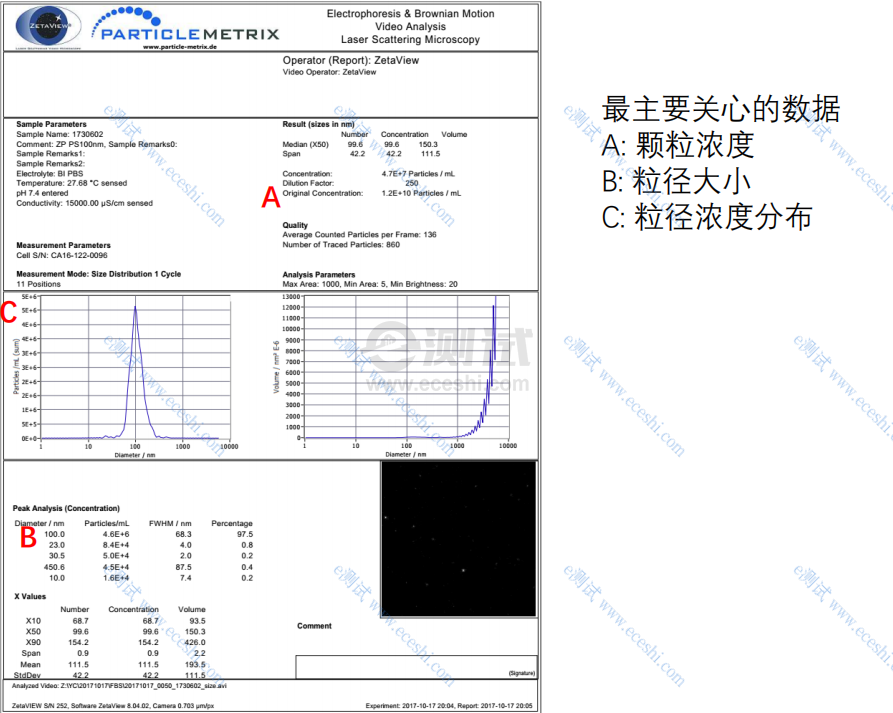 利用NTA檢測儀(Zetaview(Particle Metrix))快速、穩(wěn)定地進行外泌體粒徑、濃度鑒定。其方法原理即納米顆粒跟蹤分析(Nanoparticle Tracking Analysis,NTA),單一顆粒跟蹤技術(shù)并結(jié)合經(jīng)典微電泳技術(shù)(zeta電位)和布朗運動,利用Stockes-Einstein方程式計算出納米顆粒的流體力學(xué)直徑和濃度。